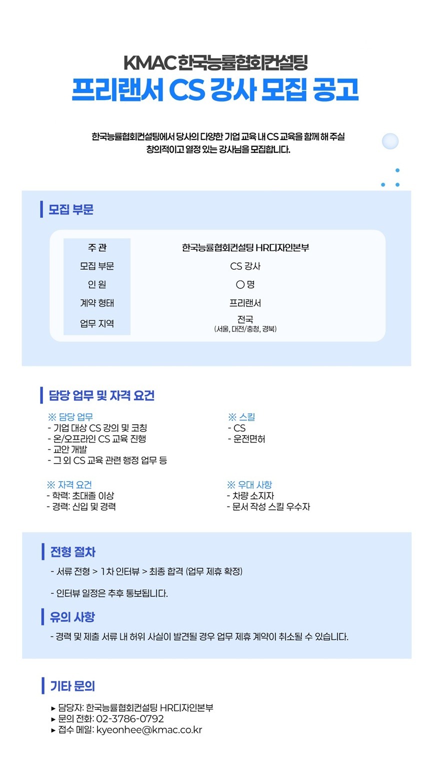[KMAC 한국능률협회컨설팅] 프리랜서 CS 강사 모집 공고"를 아래와 같이 안내하오니 많은 관심 부탁드립니다.